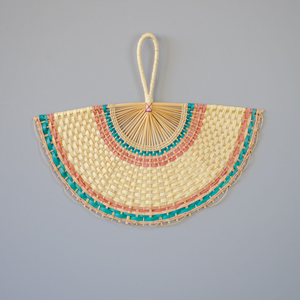 Leque de palha colorido trançado em fibra de buriti pela etnia indígena Baré