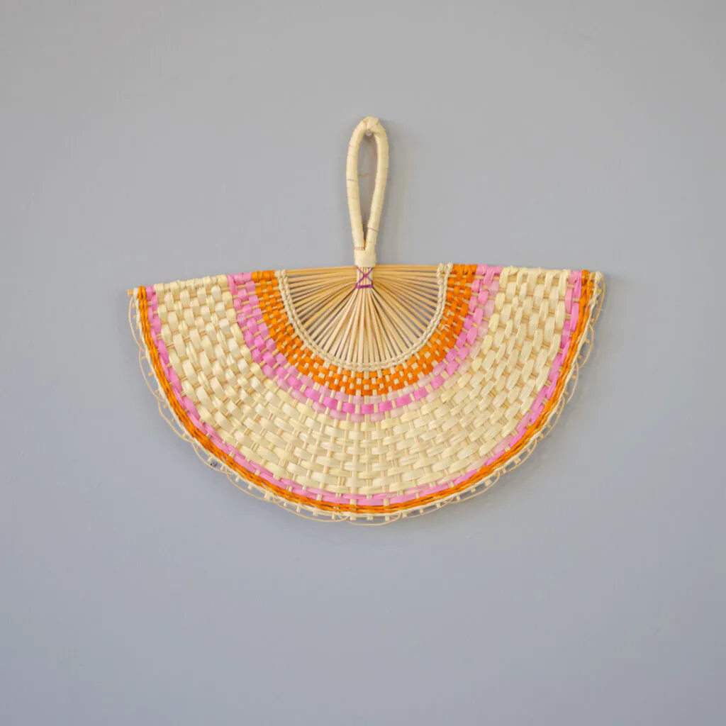 Leque de palha colorido trançado em fibra de buriti pela etnia indígena Baré