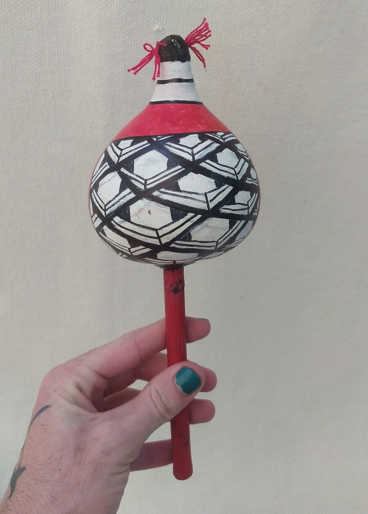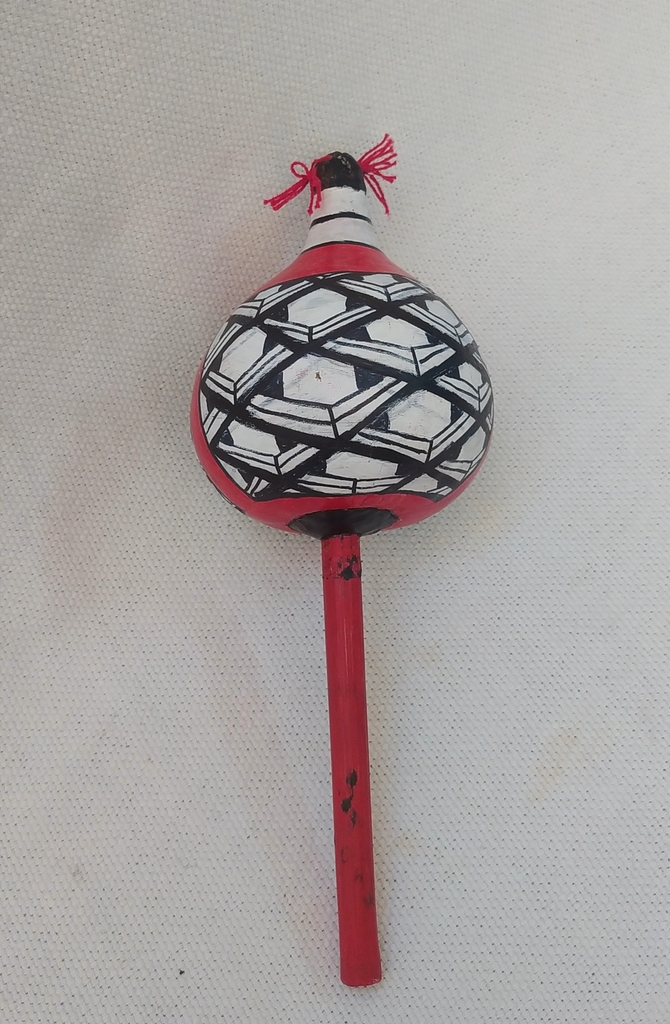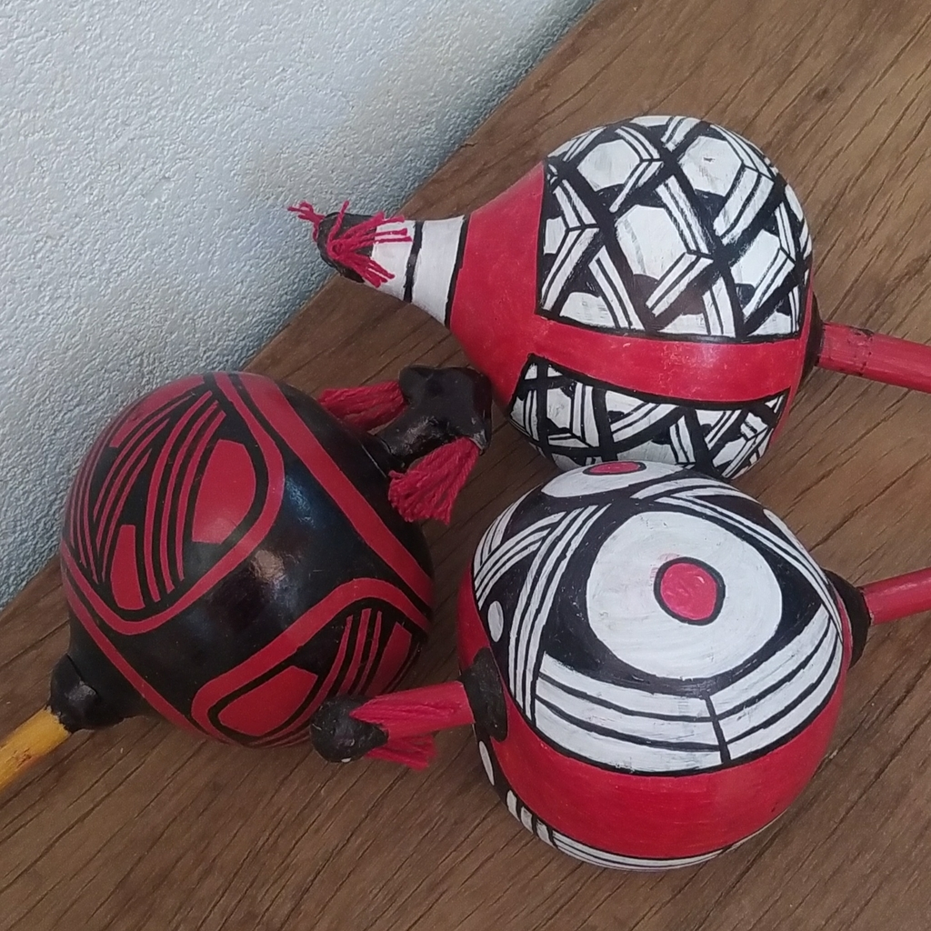 Maracá Indígena feito de cabaça e sementes, com pintura natual. Instrumento sagrado utilizado em rituais e brincadeiras