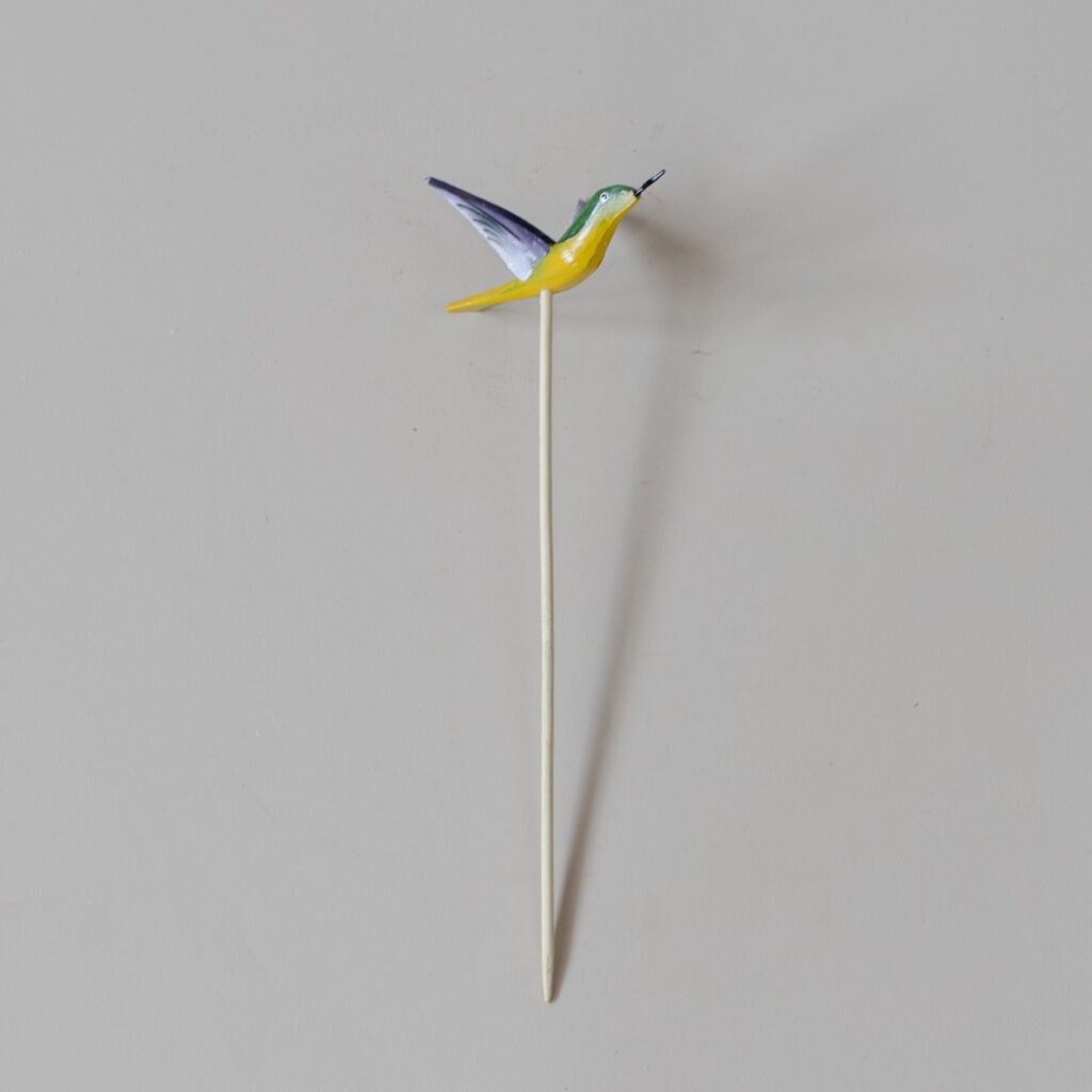 Beija-flor em madeira com estaca, esculpidos e pintados manualmente, para decoração de plantas e jardins.