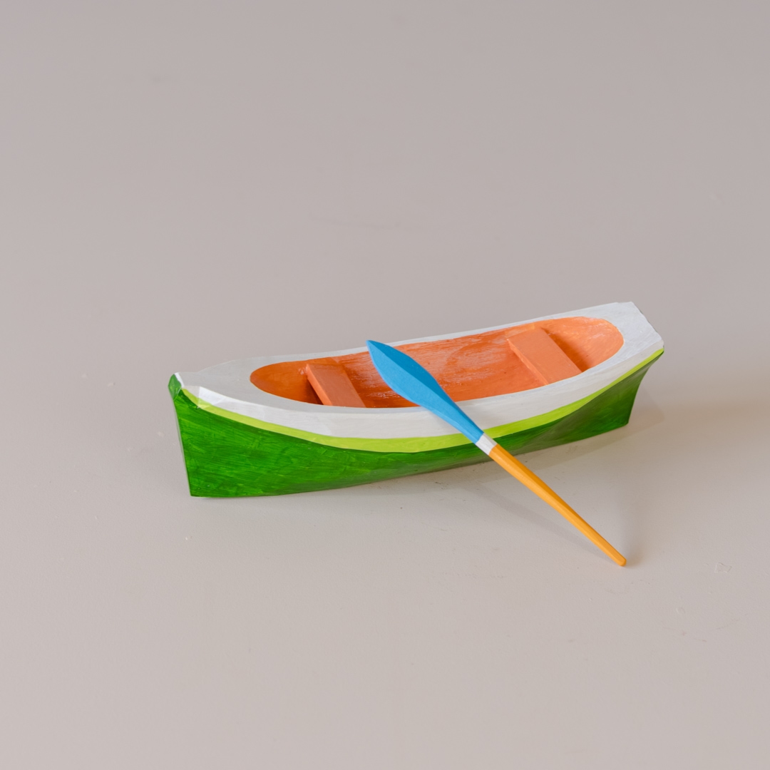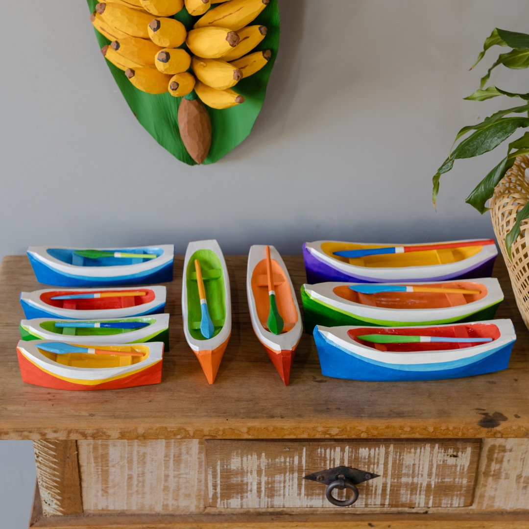 Mini canoa de madeira com remo, esculpidos e pintados manualmente