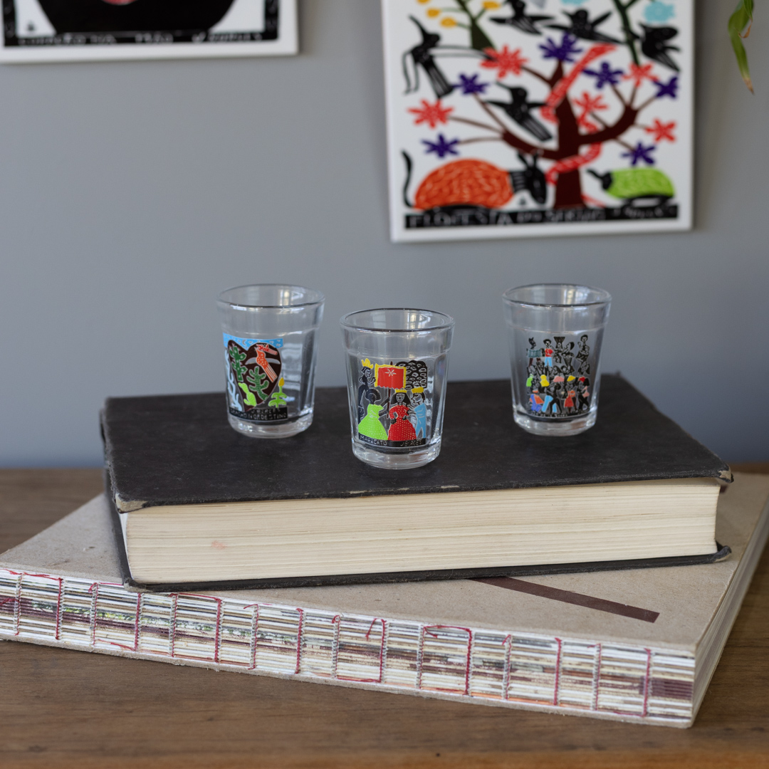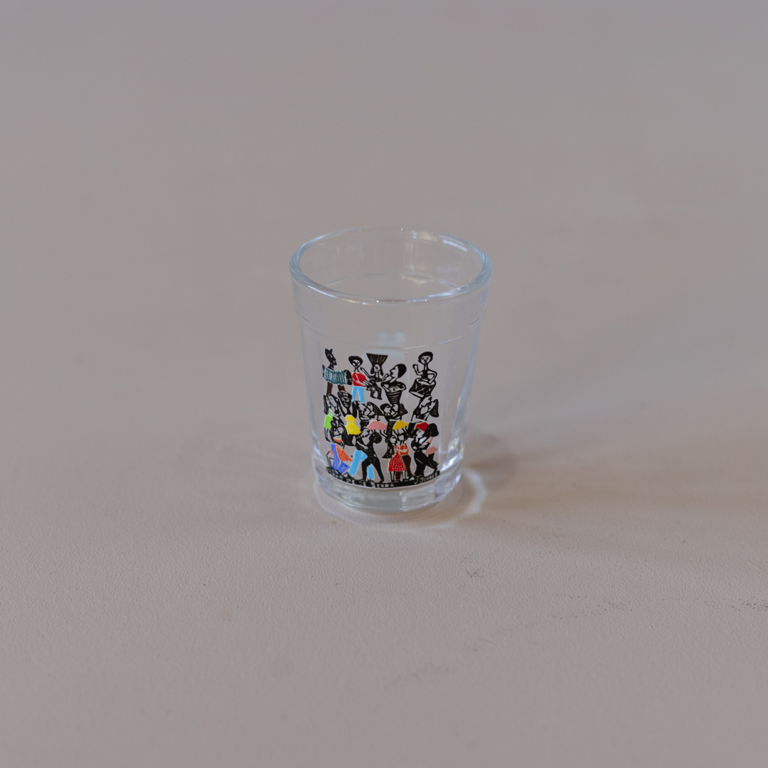 Copinho de cachaça de vidro estampado com xilogravura de J. Borges
