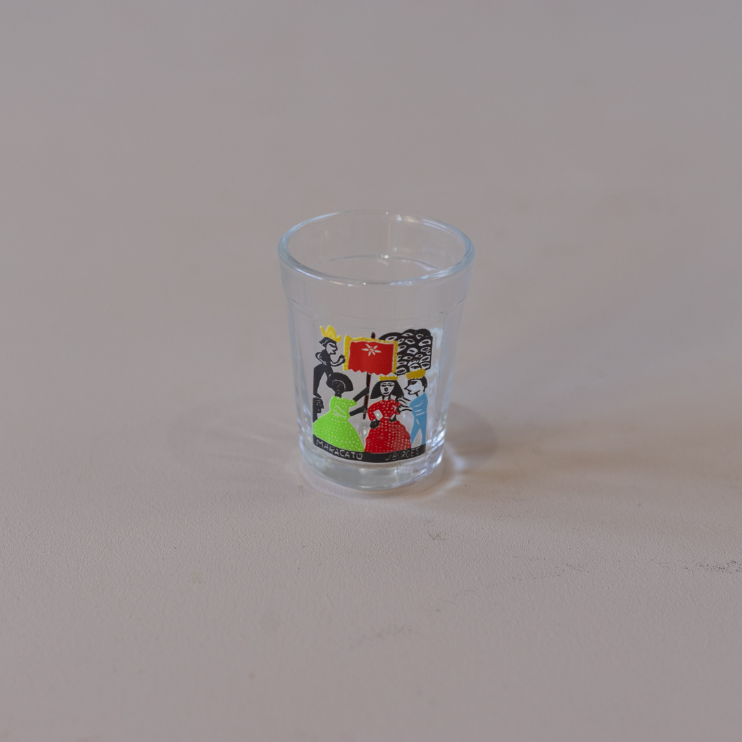 Copinho de cachaça de vidro estampado com xilogravura de J. Borges
