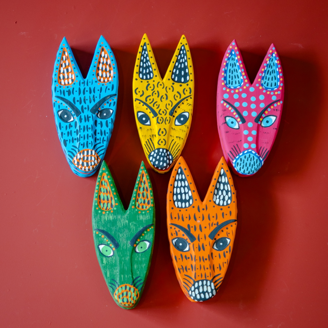 Máscara de parede em madeira pintada a mão feita pelo artesão Zé Crente na Ilha do Ferro