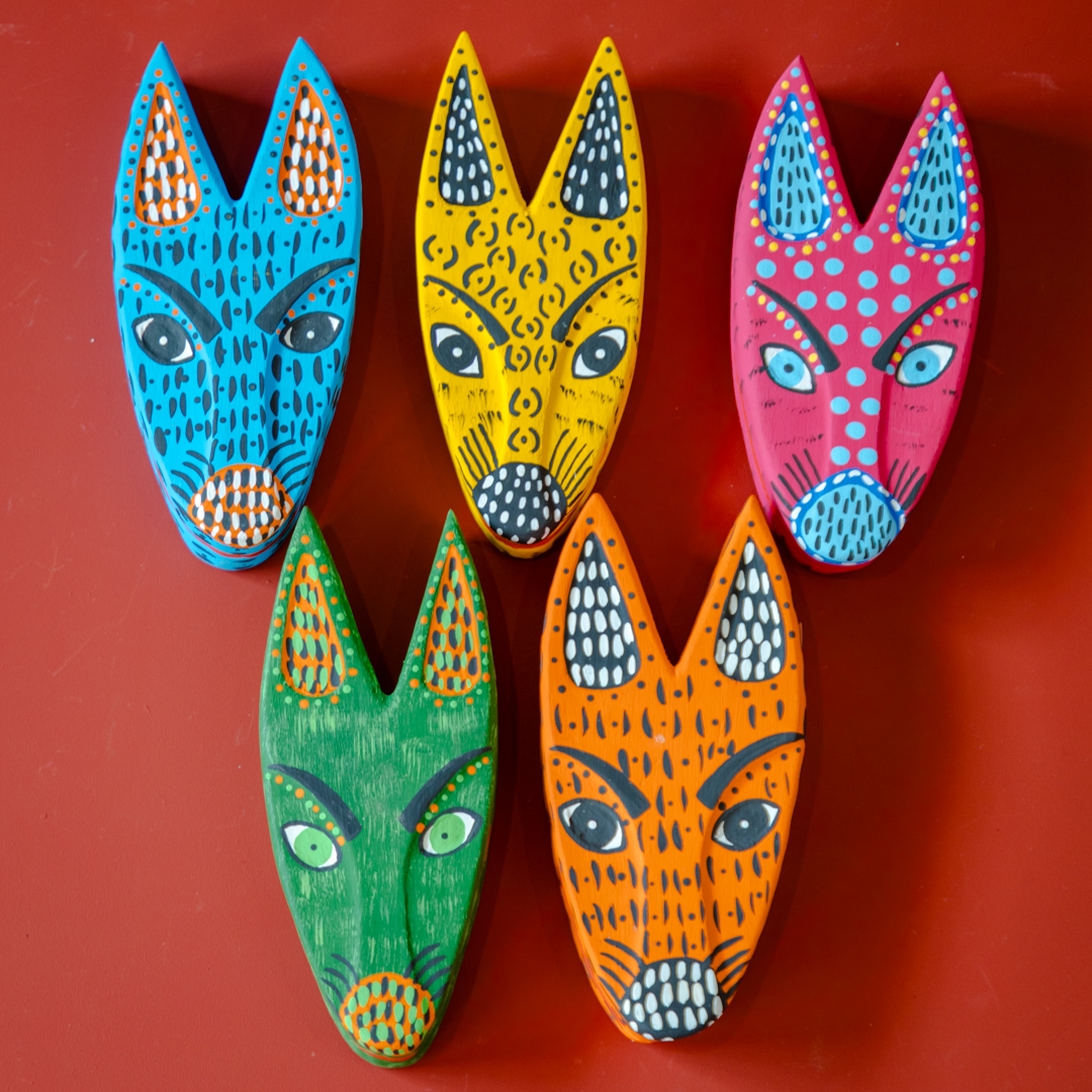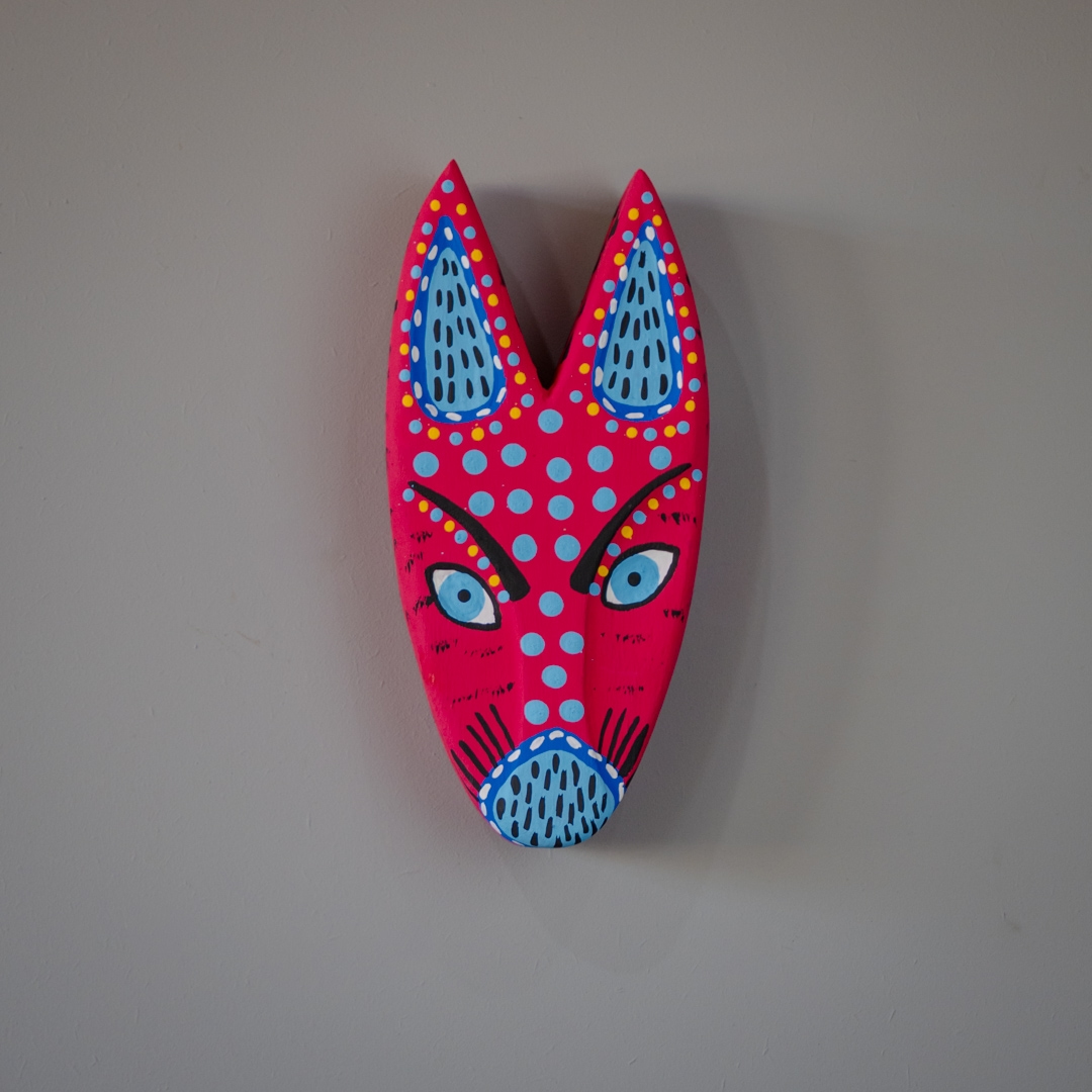 Máscara de parede em madeira pintada a mão feita pelo artesão Zé Crente na Ilha do Ferro