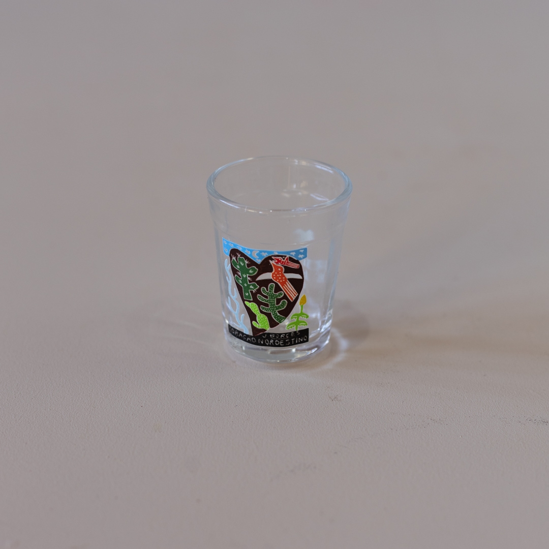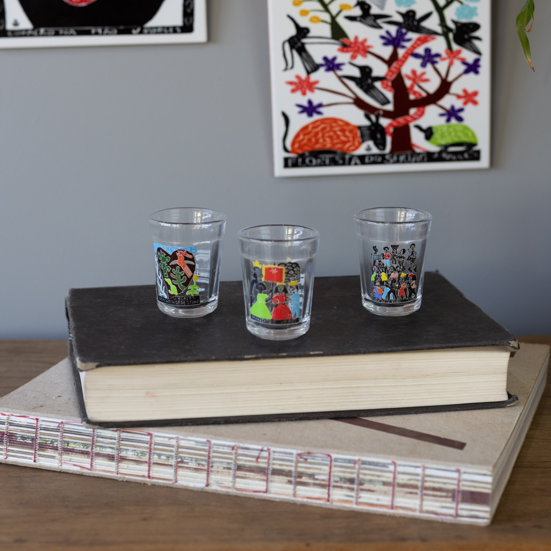Copinho de cachaça de vidro estampado com xilogravura de J. Borges