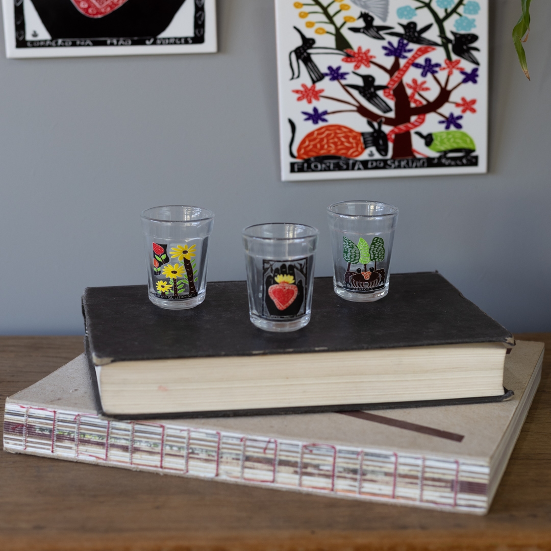 Copinho de cachaça de vidro estampado com xilogravura de J. Borges