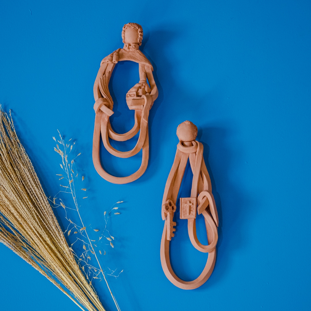 A expressão artística sempre permeou o universo de Maria Tereza Rossin, já que sua mãe era professora de artes. Apesar de ser formada em psicologia e exercer a profissão durante anos, o talento artístico sempre falou alto. E a partir de 1990 o barro começou a tomar cada vez mais espaço em sua vida. Em 2013 teve duas figuras religiosas selecionadas para o 3º Salão Nacional de Cerâmica, promovido pelo Museu Alfredo Andersen, de Curitiba. Tereza percebeu que na cerâmica “poderia trabalhar em 3 dimensões aquilo que não conseguia criar em duas”. Apaixonada pelo artesanato, não parou mais, e segue desenvolvendo coleções únicas, como essas figuras estilizadas com base em desenhos exclusivos elaborados por seu marido Oscar Rossin, psicólogo e aquarelista. Para moldar ela usa uma argila canadense e realiza a queima a 900º, o que permite um acabamento especial, imprimindo toda essa leveza às peças. Sim, porque as formas e os detalhes são de uma delicadeza ímpar.