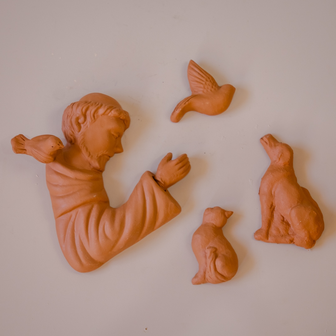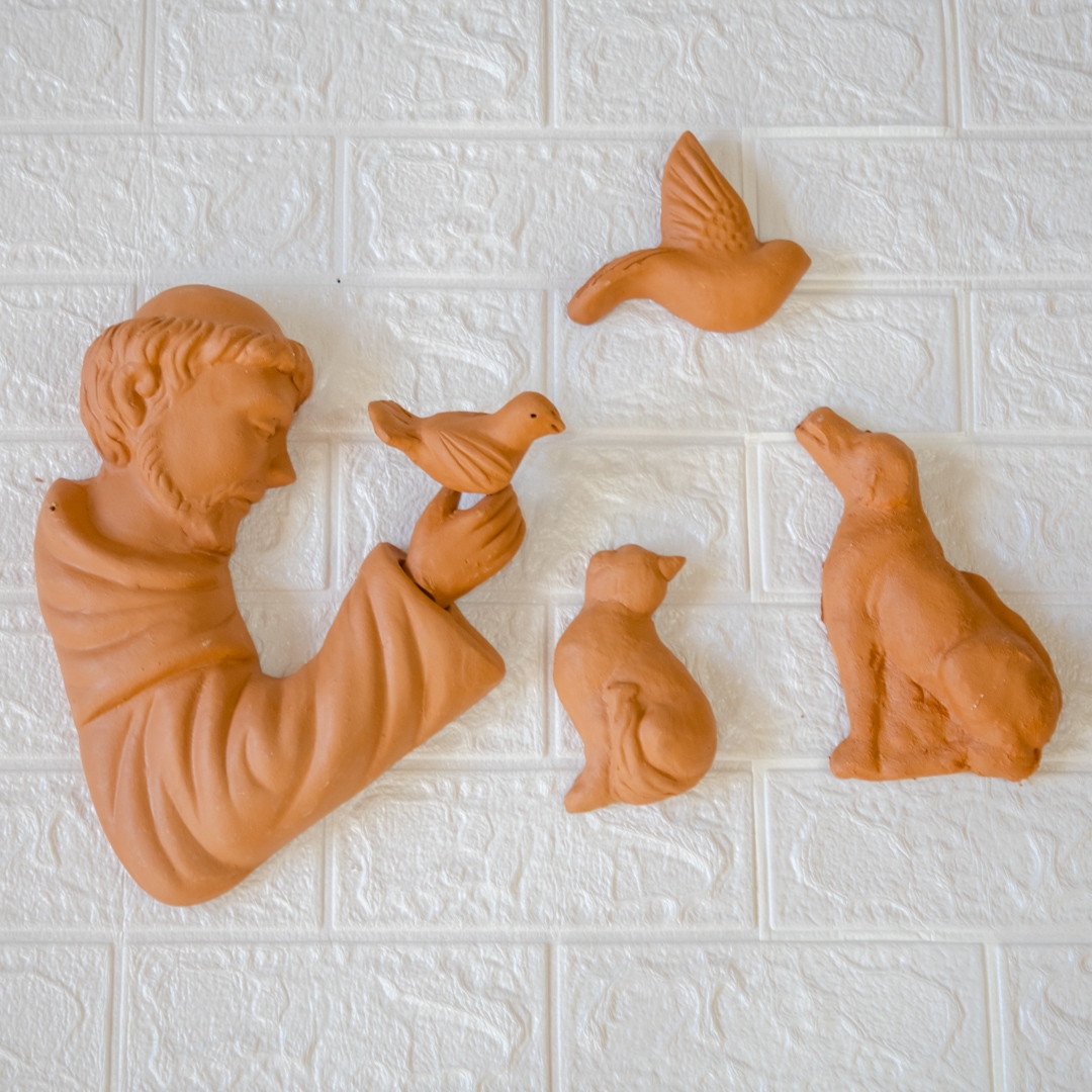 São Francisco de cerâmica parede com animais (acompanha 1 cachorro, 1 gato e 2 passarinhos)