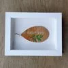 Folha natural com bordado manual em moldura caixa branca com suporte para parede ou mesa