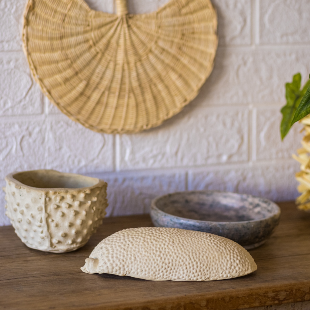 Rosalva é uma artista pernambucana que produz peças em cerâmicas a partir da inspiração pelos elementos naturais e culturais do Nordeste. A identidade de suas peças é única, repletas de texturas e formas orgânicas, fruto de mais de 20 anos de trabalho. Formada em design gráfico, descobriu através do barro que o que lhe fazia feliz era produzir com as mãos: “Na cerâmica tive os meus maiores e melhores confrontos e encontros ao trabalhar com a matéria viva, o barro. A troca de energia e o diálogo que se estabeleceu com o ‘fazer com as mãos’, foi minha mais verdadeira conexão com nossa ancestralidade”.