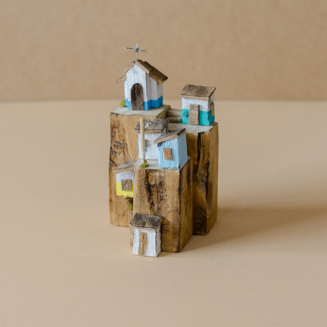 Blocos de madeira com casinhas, esculpidos e pintados à mão