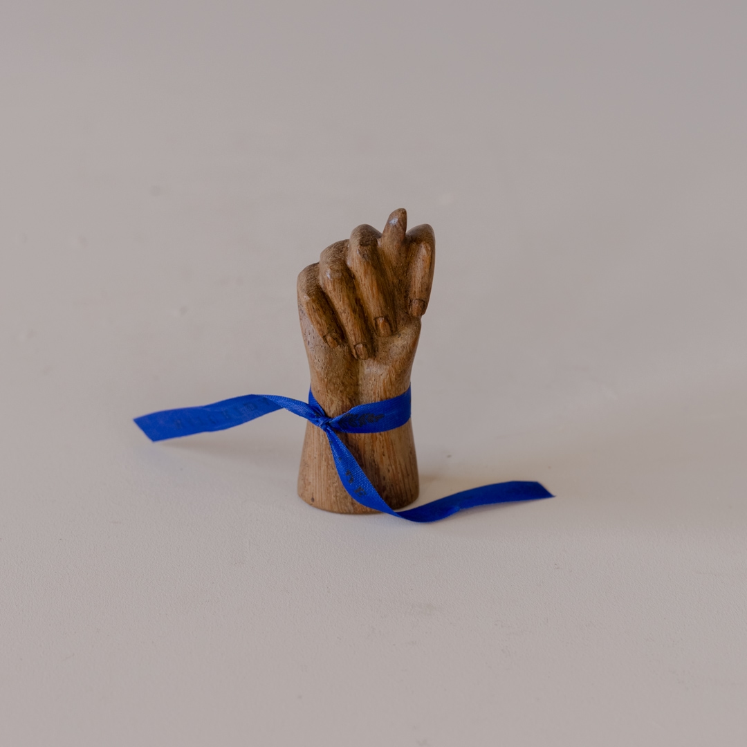 Amuleto figa esculpido em madeira com fita colorida