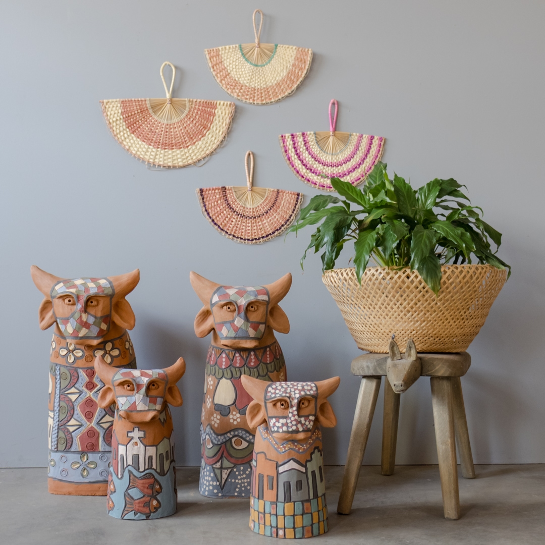 Escultura boi Bumbá de cerâmica feita manualmente, com adornos em baixo relevo
