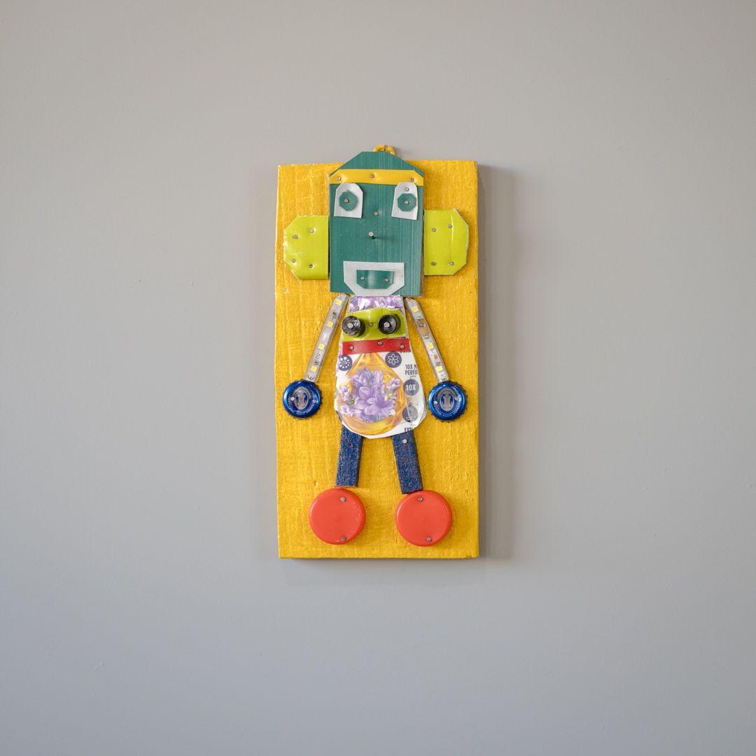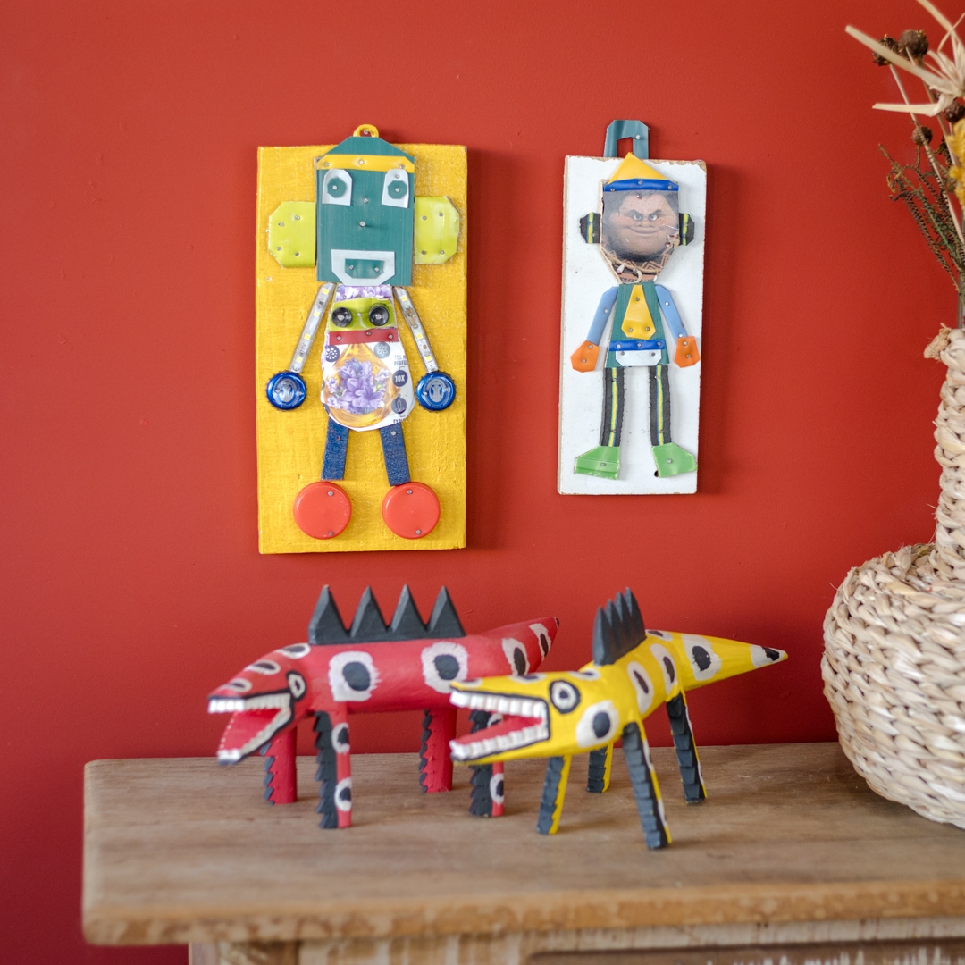 Quadro em madeira e materiais reciclados, com suporte para parede