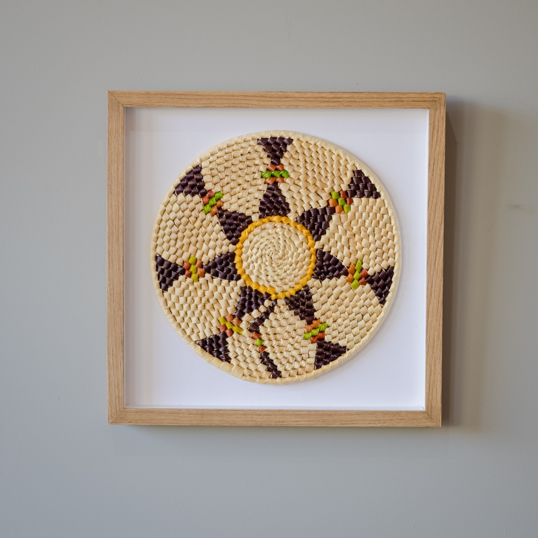 Mandala de palha de tucumã com tingimento natural em moldura caixa sem vidro e com suporte para pendurar
