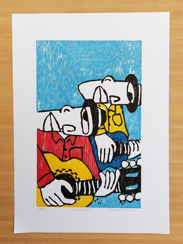 Há 24 anos Manoel Rufino saía de Pernambuco para tentar a vida em São Paulo. Jovem, fez carreira na indústria, onde chega a trabalhar 12 horas por dia até hoje, mas a escala de trabalho lhe permite começar os fins de semana na sexta-feira. Ainda bem, porque é aí que ele dá vazão à sua arte. Desde menino Manoel pinta telas. Fazia quadros enormes, até que chegou a pandemia, em 2020 e ele precisou se mudar da casa grande onde morava. "Aí precisei diminuir as telas", conta. Nessa época também, o mercado da arte sofreu. Não era prioridade de ninguém. Foi quando ele experimentou seguir pelo caminho da xilogravura: “A xilo é a cultura do meu Nordeste. É o dia a dia das pessoas, as festas regionais, paisagens, bichos, a tristeza dos retirantes da seca, o pau de arara, o carcará. A festa junina é muito importante para nós", diz ele, que elege a de Caruaru como sua preferida”