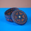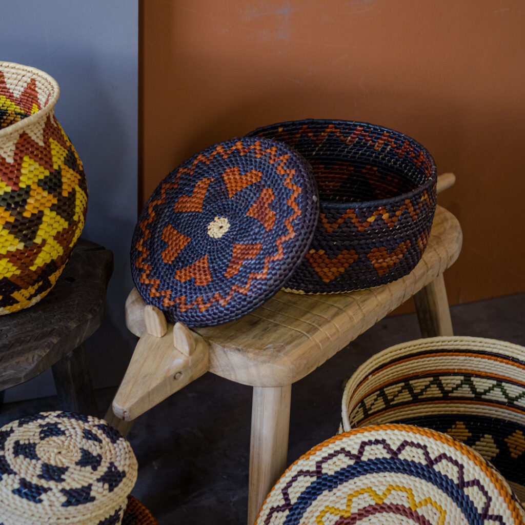Balaio trançado manualmente em palha de tucumã, com pigmentos naturais extraídos de frutos e folhas nativas