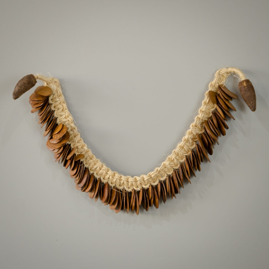 Colar de parede ou mesa feito com sementes pintadas, aplicadas sobre corda