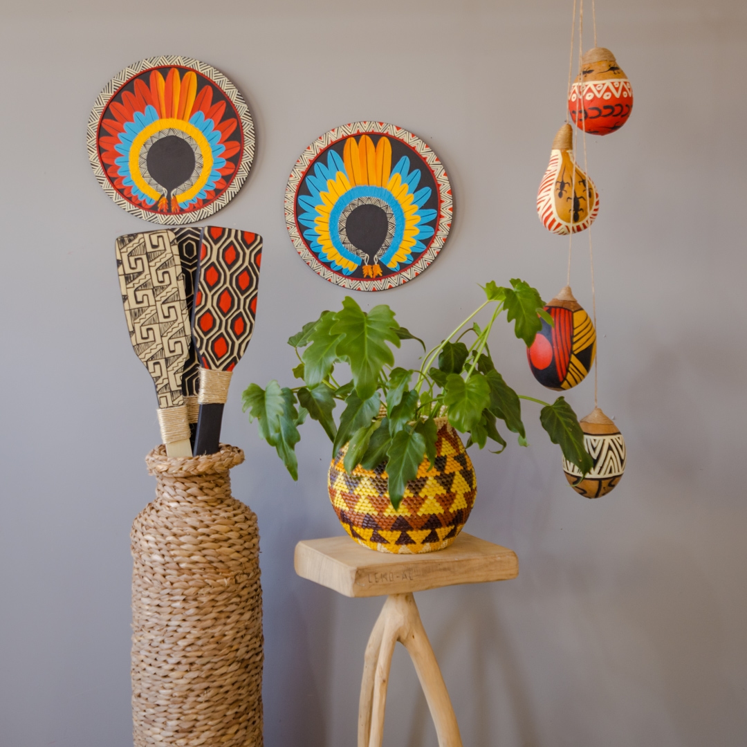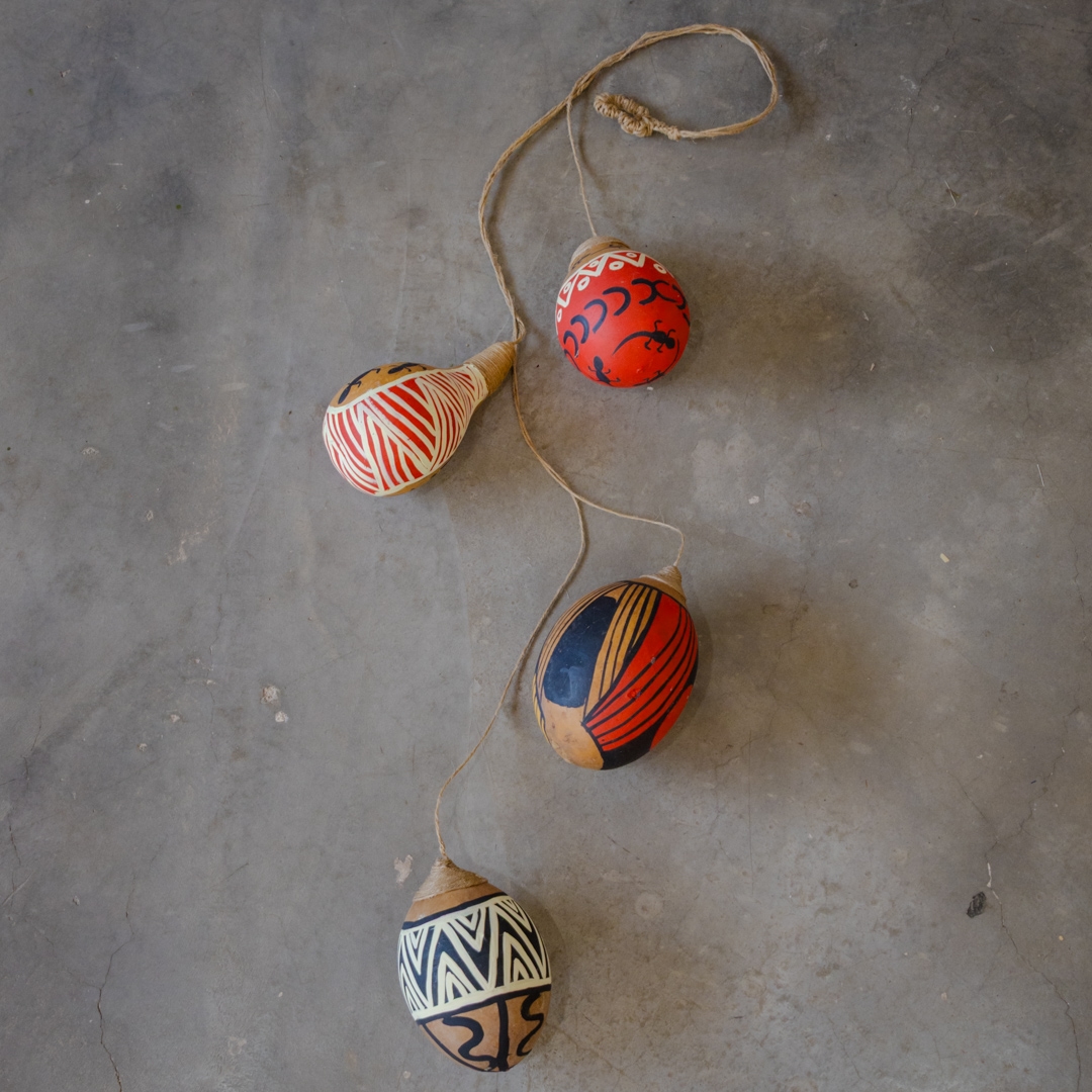 Adorno de parede feito de cabaças pintadas a mão em fio de sisal