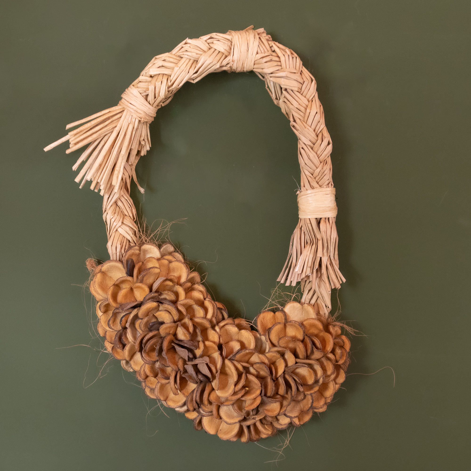 Colar de parede ou mesa feito com sementes, aplicadas sobre corda