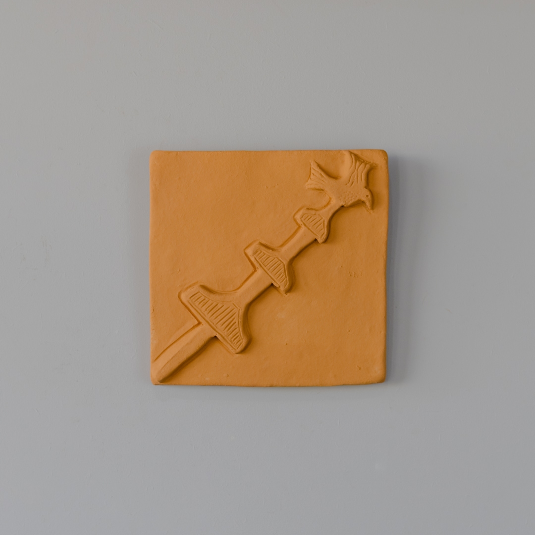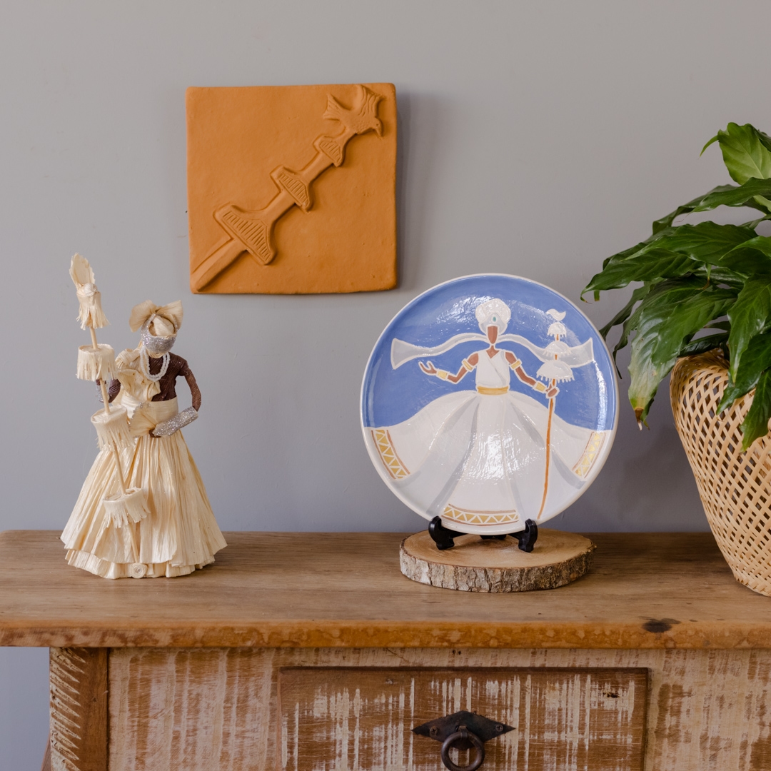 Placa para parede em cerâmica com símbolos representando orixás, moldada manualmente