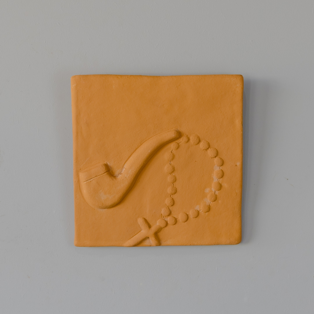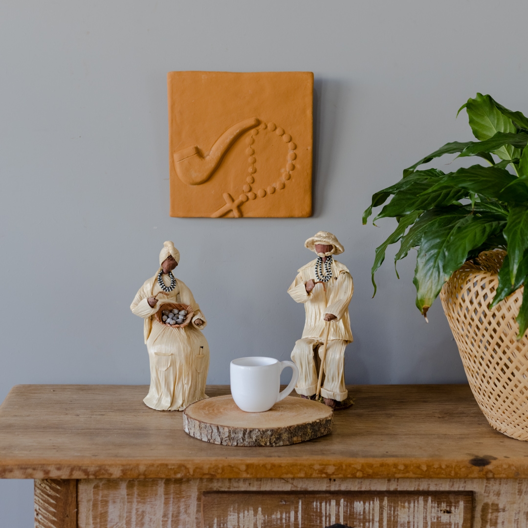 Placa para parede em cerâmica com símbolos representando orixás, moldada manualmente