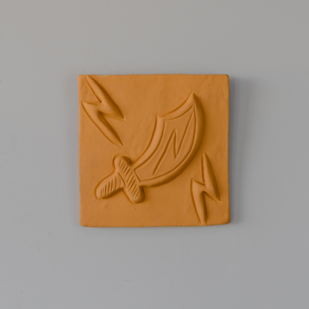 Placa para parede em cerâmica com símbolos representando orixás, moldada manualmente