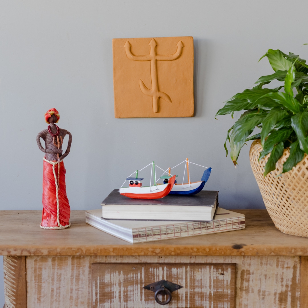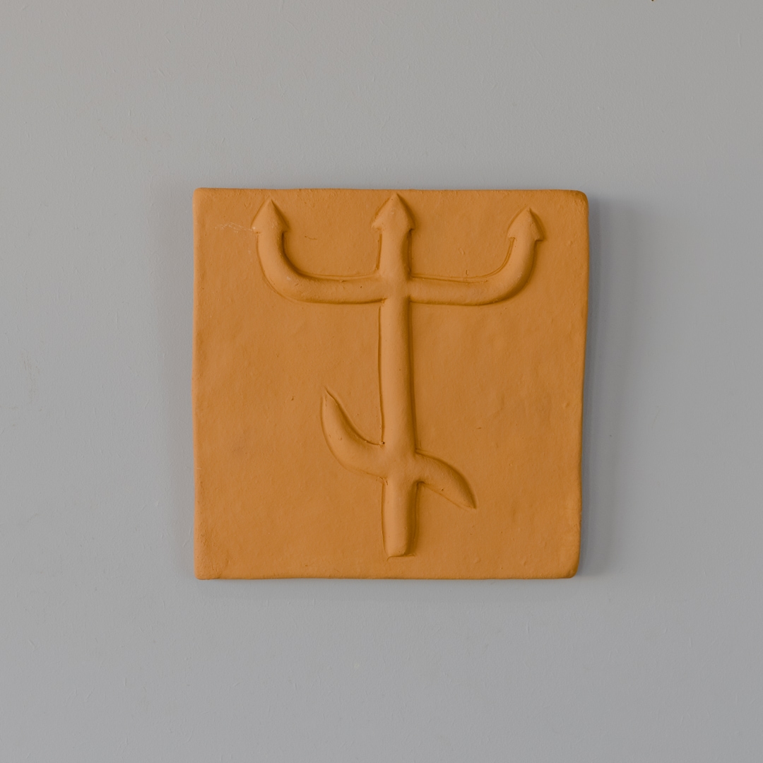 Placa para parede em cerâmica com símbolos representando orixás, moldada manualmente