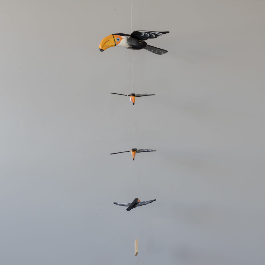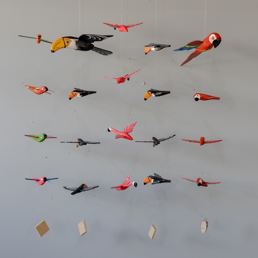 Móbile pendente de aves em madeira, feito e pintado manualmente