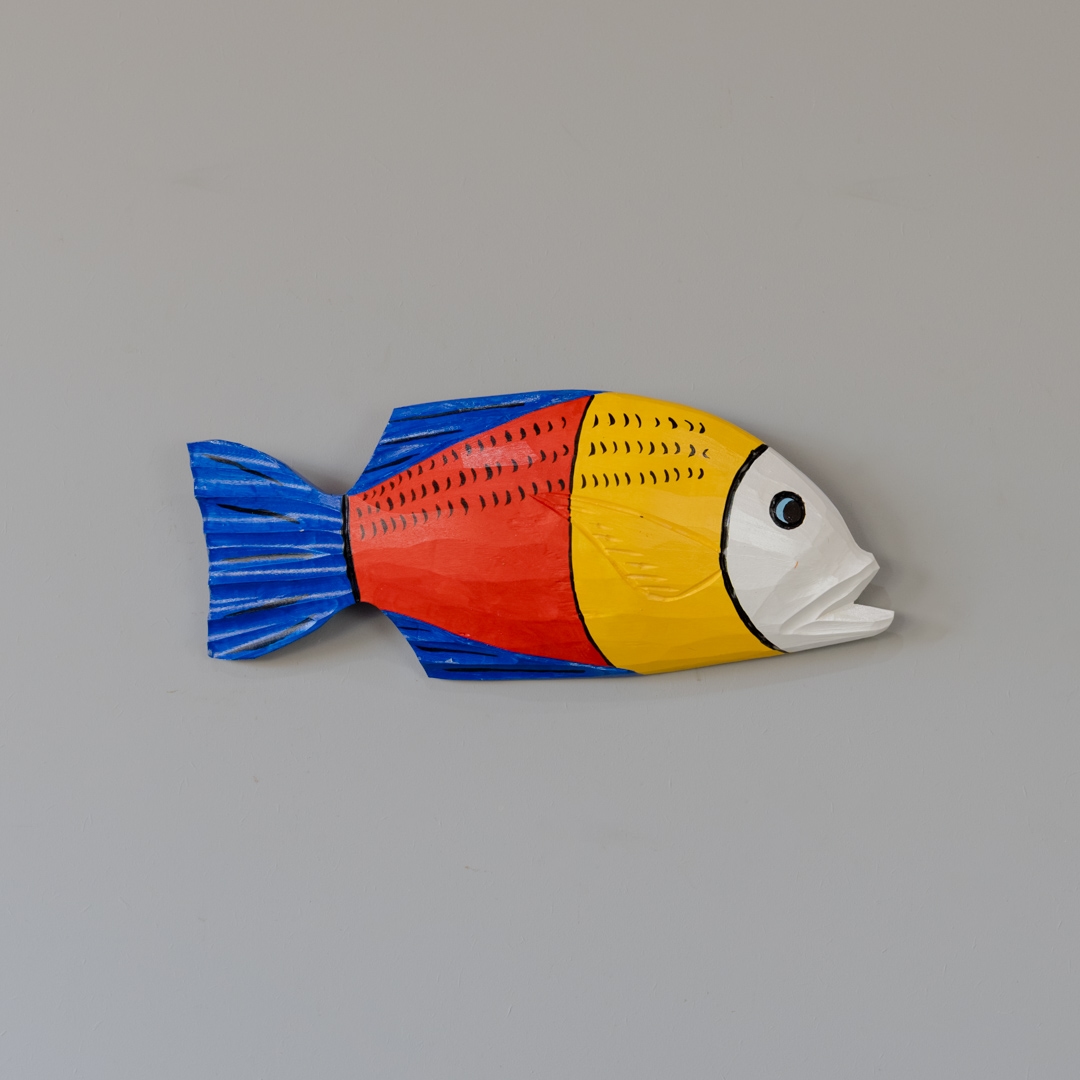 Peixe de parede de madeira, esculpido e pintado manualmente