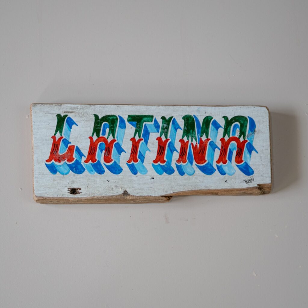 Placa para parede feita em madeira de barcos e escrita com letras ornamentadas