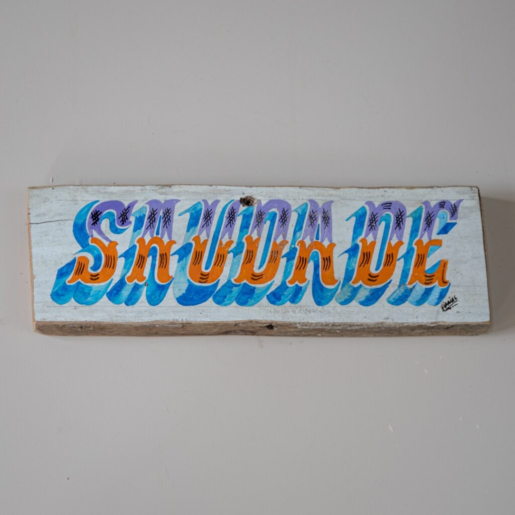Placa para parede feita em madeira de barcos e escrita com letras ornamentadas