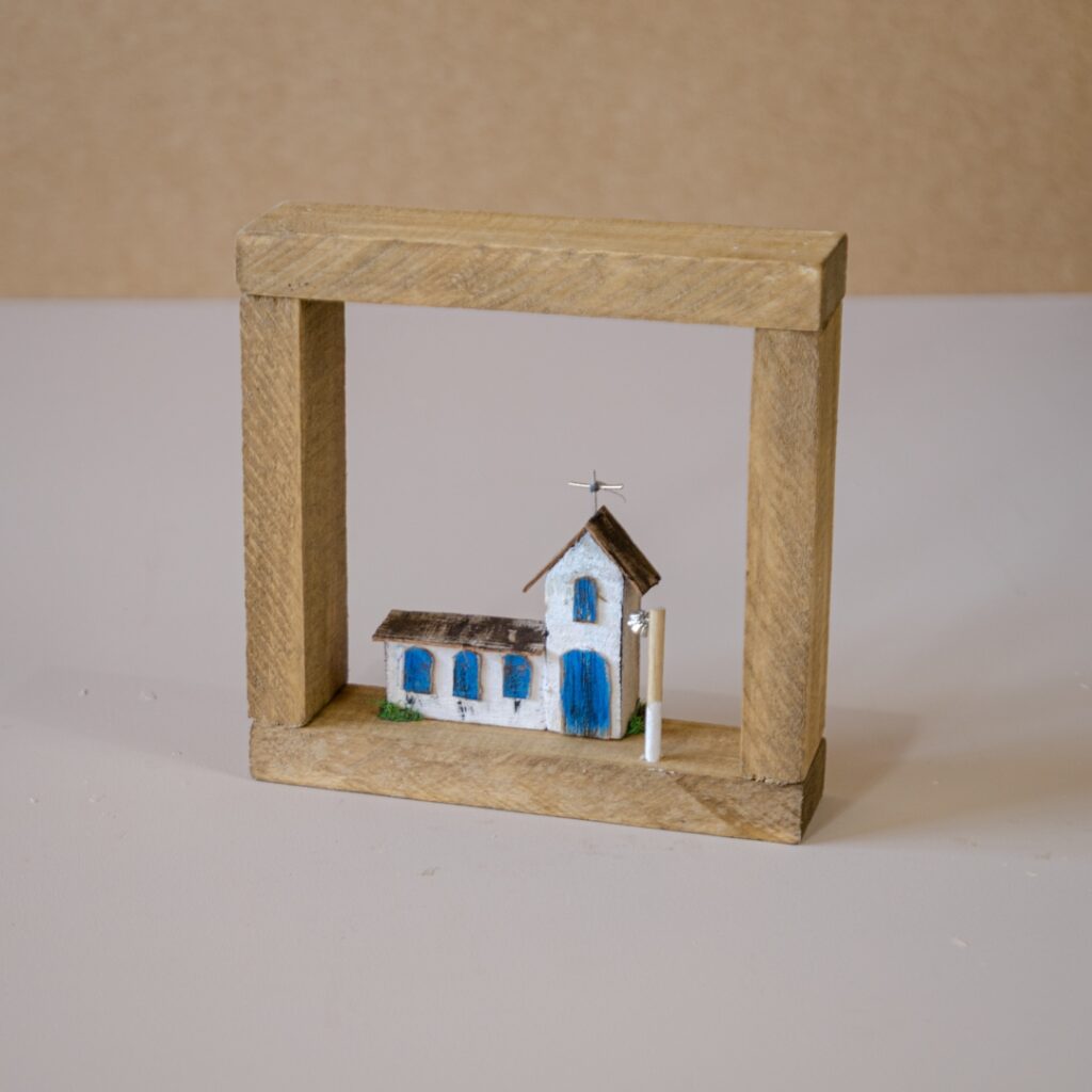 Quadro de igrejinha de madeira, esculpida e pintada à mão