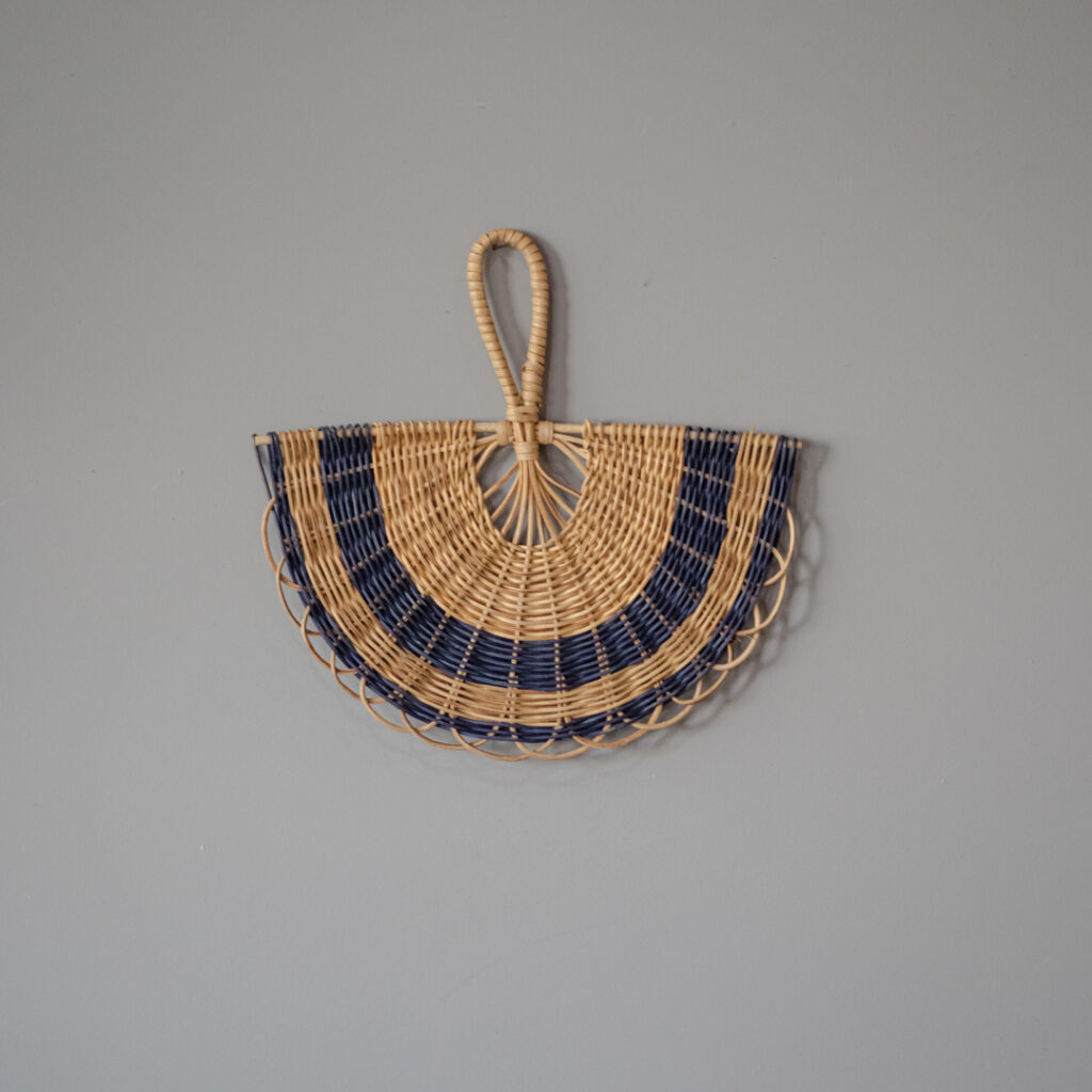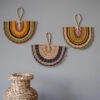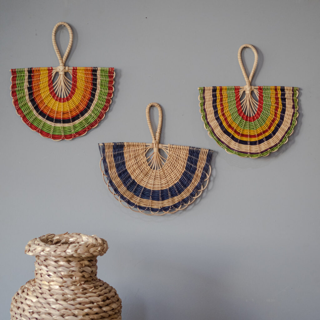 Leque de palha colorido trançado em cipó Tamanho: 23cm altura x 23cm largura x 0,5cm profundidade
