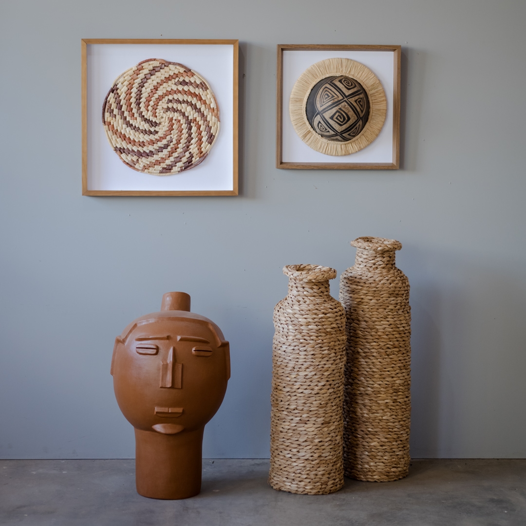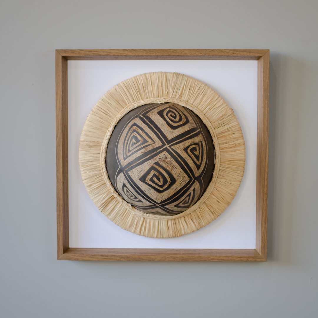 Adorno de parede feito com palha e cuia com grafismos em moldura caixa sem vidro e com gancho para pendurar