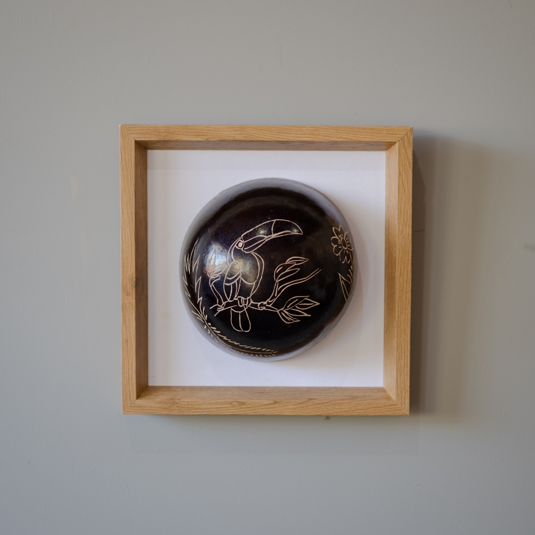 Cuia com desenhos indigenas em moldura caixa sem vidro e com gancho para pendurar
