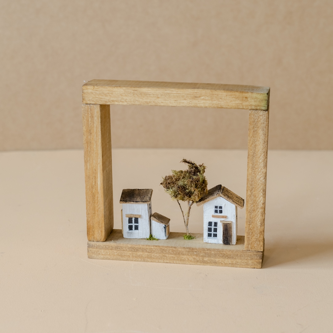 Quadro de casinhas de madeira, esculpidos e pintados à mão