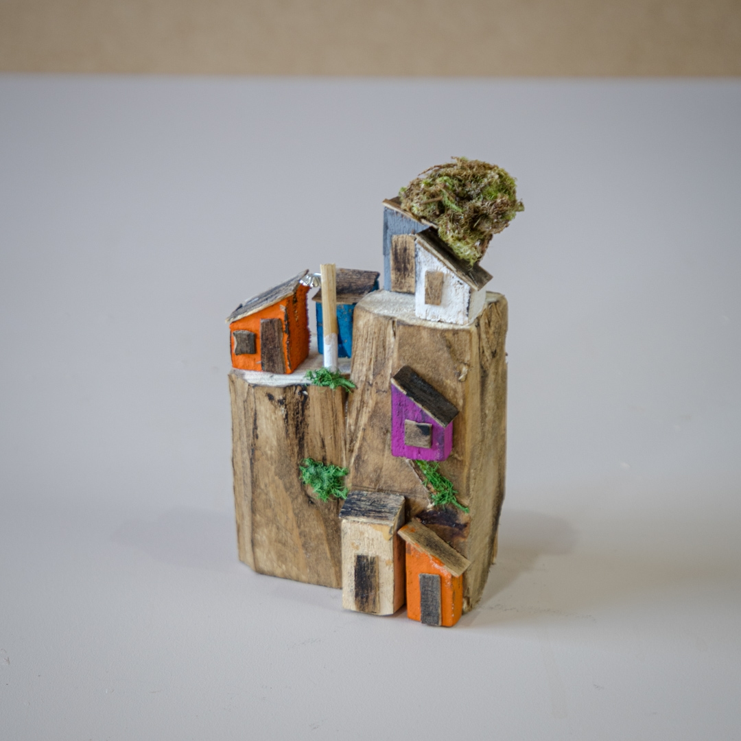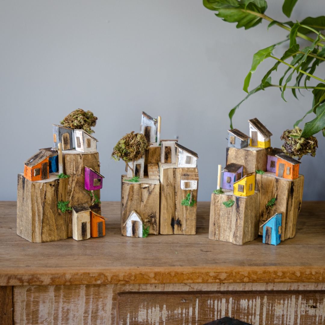 Blocos de madeira com casinhas, esculpidos e pintados à mão