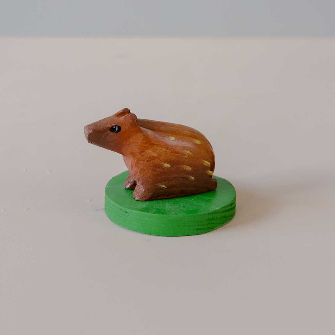 Escultura de capivara em madeira com base também em madeira, feita e pintada manualmente