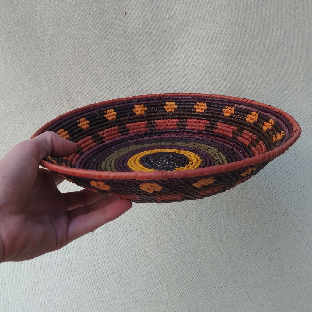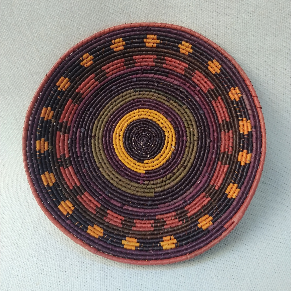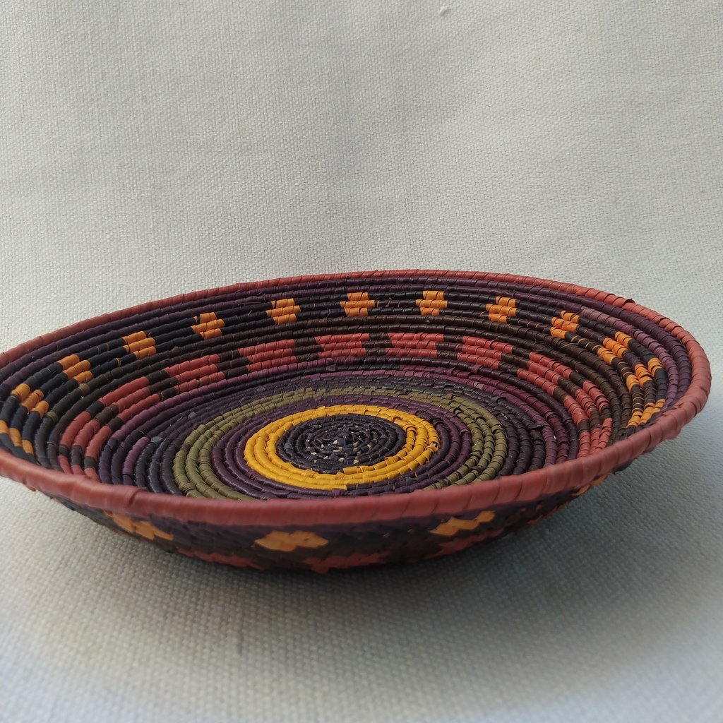 Fruteira trançada manualmente em palha de tucumã, com pigmentos naturais estraídos de frutos e folhas nativas