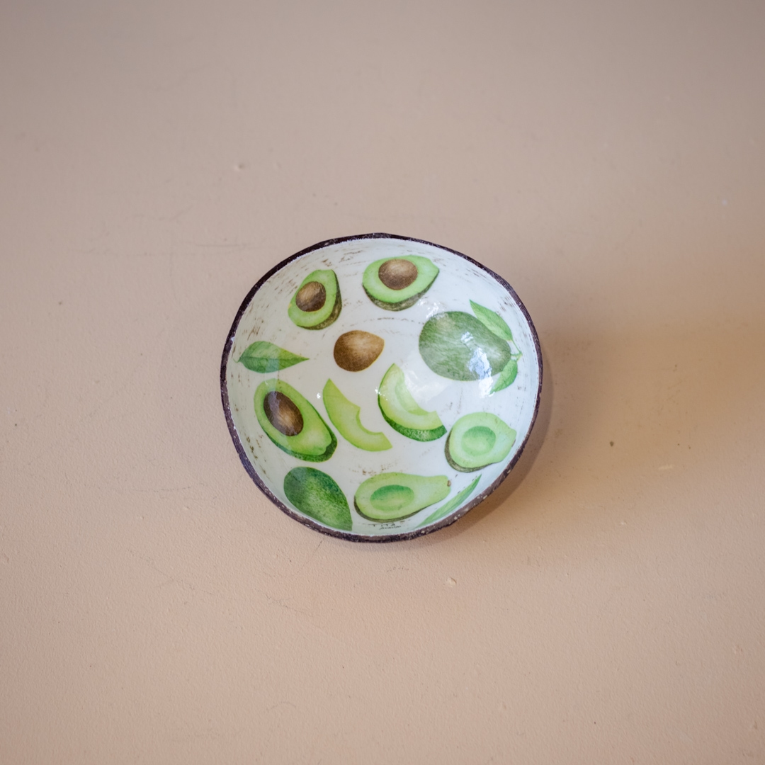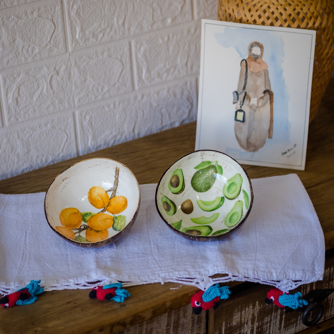 Cuia estampada feita com coco. Pode ser lavada e ter contato com alimentos