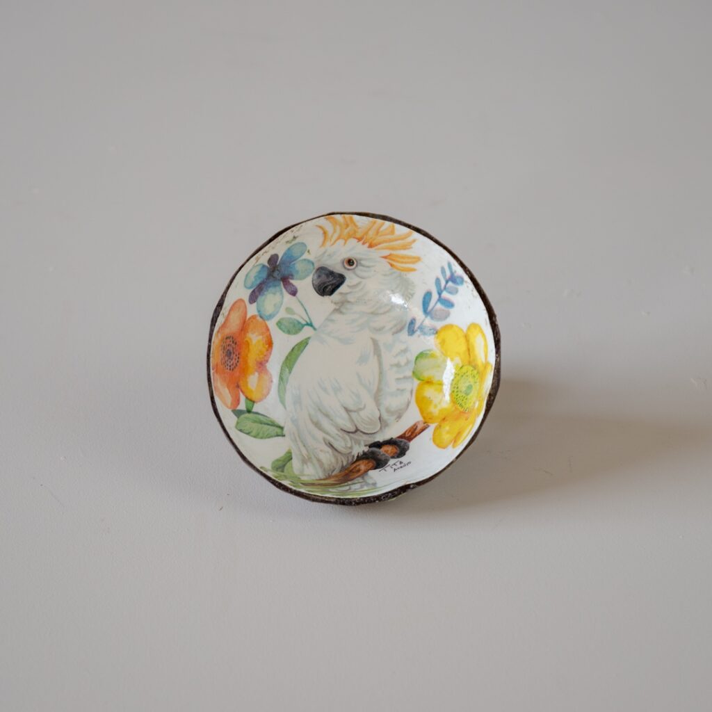 Cuia estampada feita com coco. Pode ser usada como petisqueira
