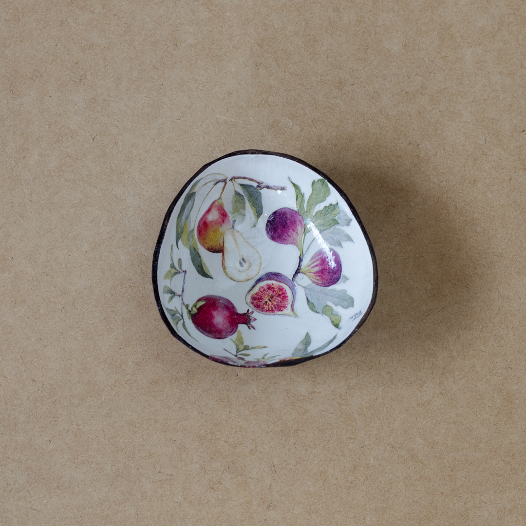 Cuia estampada feita com coco. Pode ser usada como petisqueira