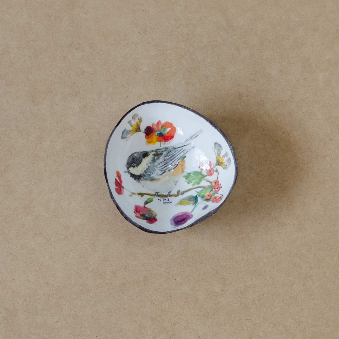 Cuia estampada feita com coco. Pode ser usada como petisqueira