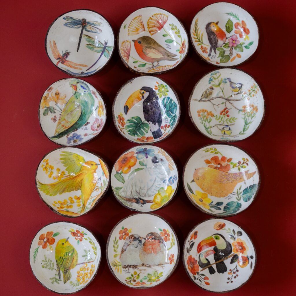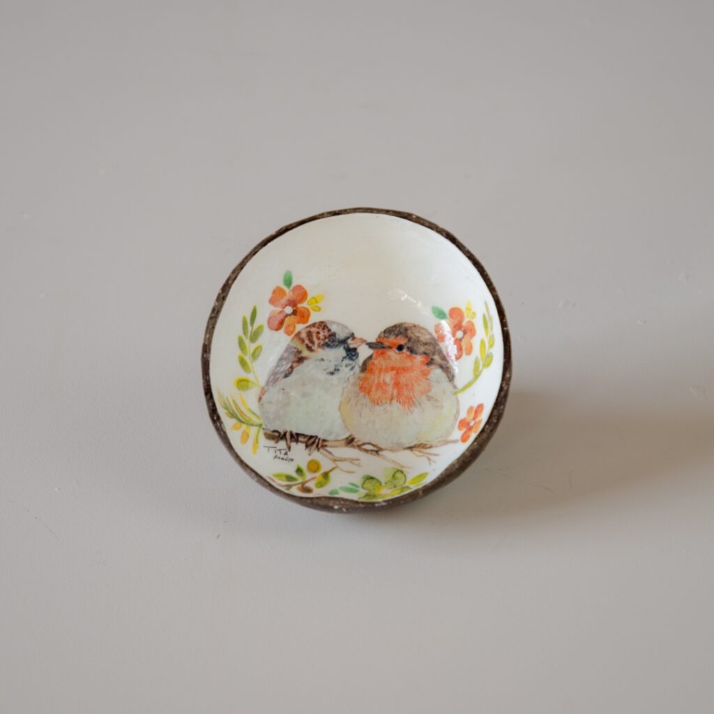 Cuia estampada feita com coco. Pode ser usada como petisqueira