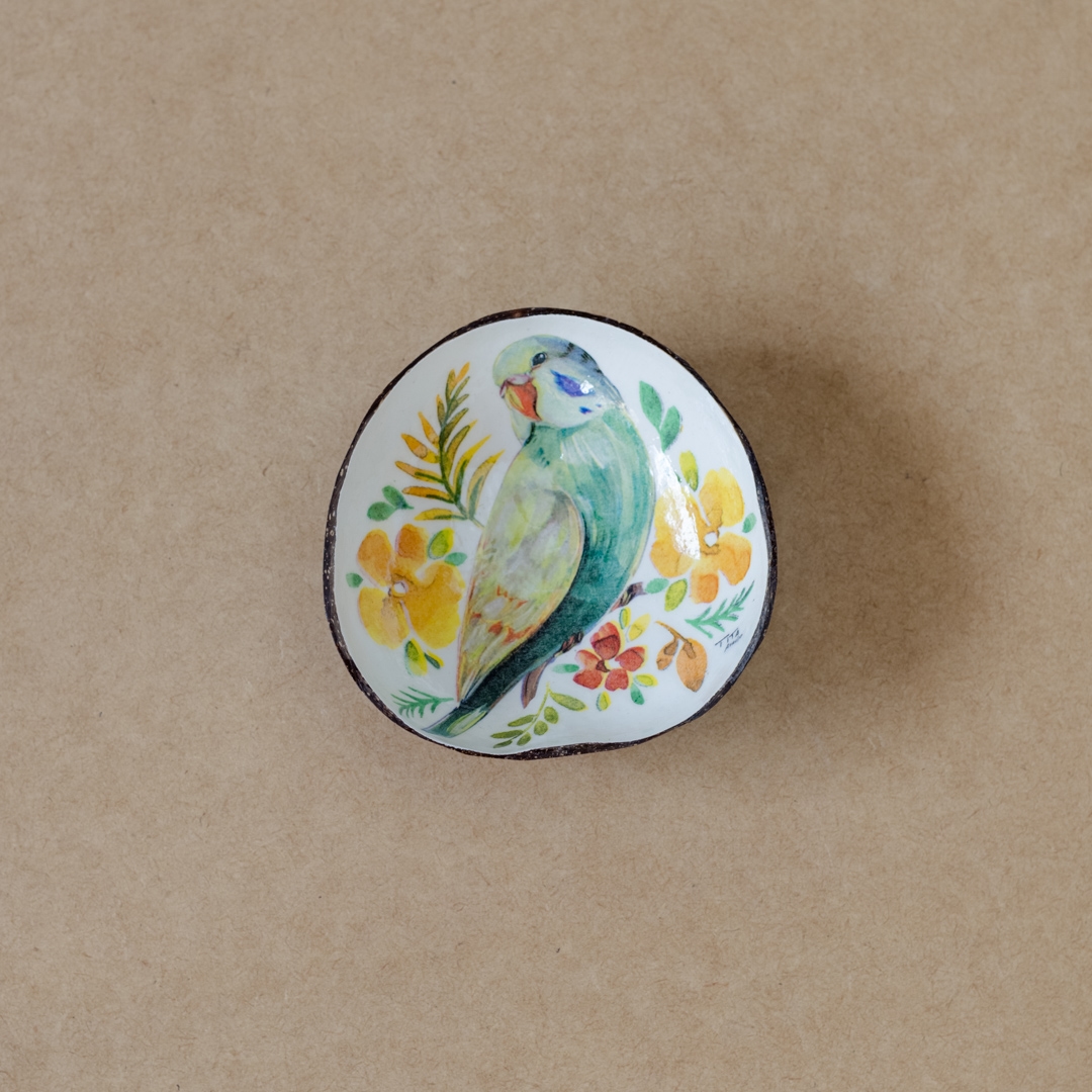 Cuia estampada feita com coco. Pode ser usada como petisqueira