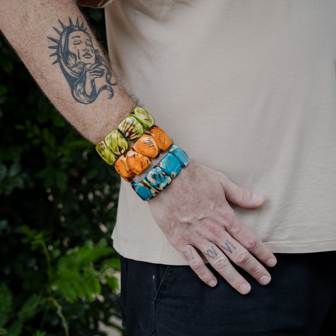 Pulseira biojóia com elástico, feita com lâminas de sementes de jarina tingidas