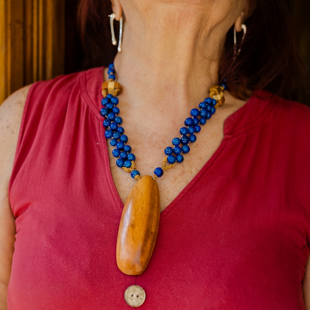 Colar biojoia feito artesanalmente com sementes de açaí e morototó tingidas e pingente de madeira. Possui fecho