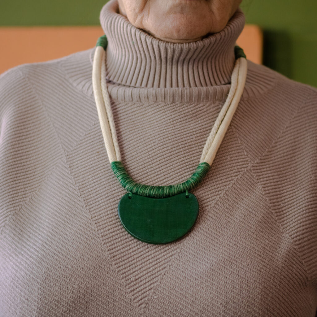 Por influencia de sua tia, Katia sempre esteve envolvida no fazer manual. Utilizando como base a corda náutica, ela começou a desenvolver uma linha de acessórios até que passou a se voltar cada vez mas aos materiais naturais. A partir do fio de algodão ela inica um processo de tingimento natural com café, e depos de fazer um curso de cerâmca começou a desenvolver os pingentes de cerâmica e madeira. Muitos de seus colares são inspirados nos elementos regionais, como as redes de pesca, os peixes e o formato dos morros da região litorânea onde vive. Peças cheias de personalidade e sensibilidade!